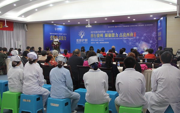 2017年11月4日,由中国护胆联盟贵阳站、贵州省慈善总会、贵州都市报、贵州电视台公共频道、贵阳社区公益联盟主办,贵阳结石病医院承办的“善行贵州·凝聚微力·点亮西南”公益行动在贵阳结石病医院隆重启动。盛会启动了“家庭防石计划·爱胆公益接力”与“精准扶贫项目·微心愿圆梦活动”两项重要工作。贵州省慈善总会医疗援助部王建主任、中国护胆联盟贵阳站执行主席周会军先生、中国护胆联盟顾问专家钟必强教授,贵阳结石病医院肝胆外科胡茂渊主任,以及贵阳社区公益联盟70多名代表、社会爱心人士共同出席了启动盛会。