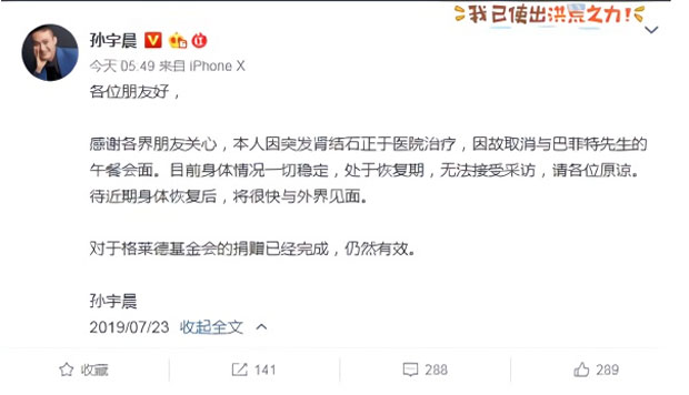 对于取消的原因,孙宇晨则表示,自己因突发肾结石正于医院治疗,目前身体情况一切稳定,处于恢复期,无法接受采访,请各位原谅。